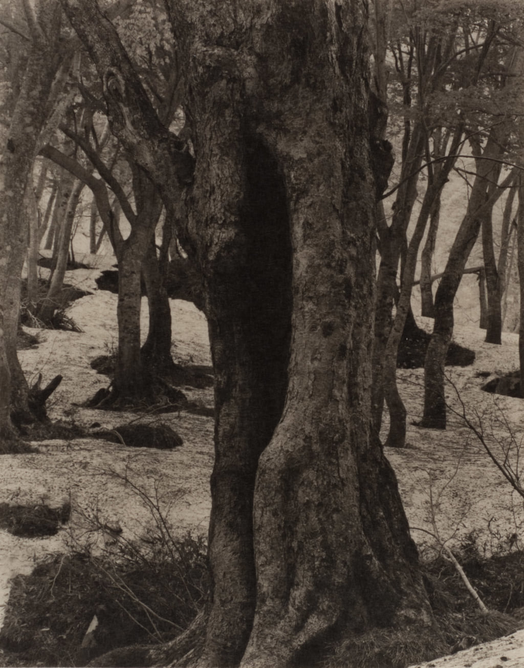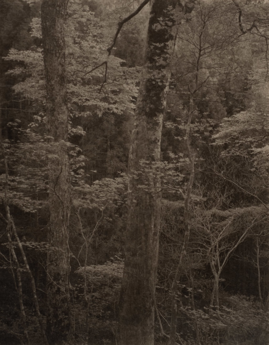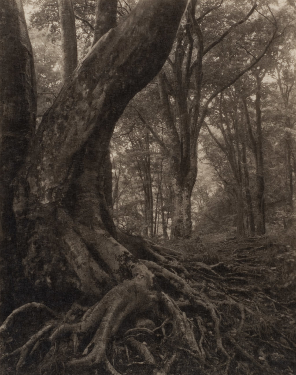 As part of an approach linked to Shintoism, the artist, born in 1948, observed the danger facing forests—linked to both climate change and the eradication of the connection between humans and nature—and decided to devote his life to it and establish a dialogue with these places that have been cherished for centuries. To do this, he uses his view camera and creates platinum-palladium prints on traditional Japanese paper, with a result that offers tones from cold black to brown.