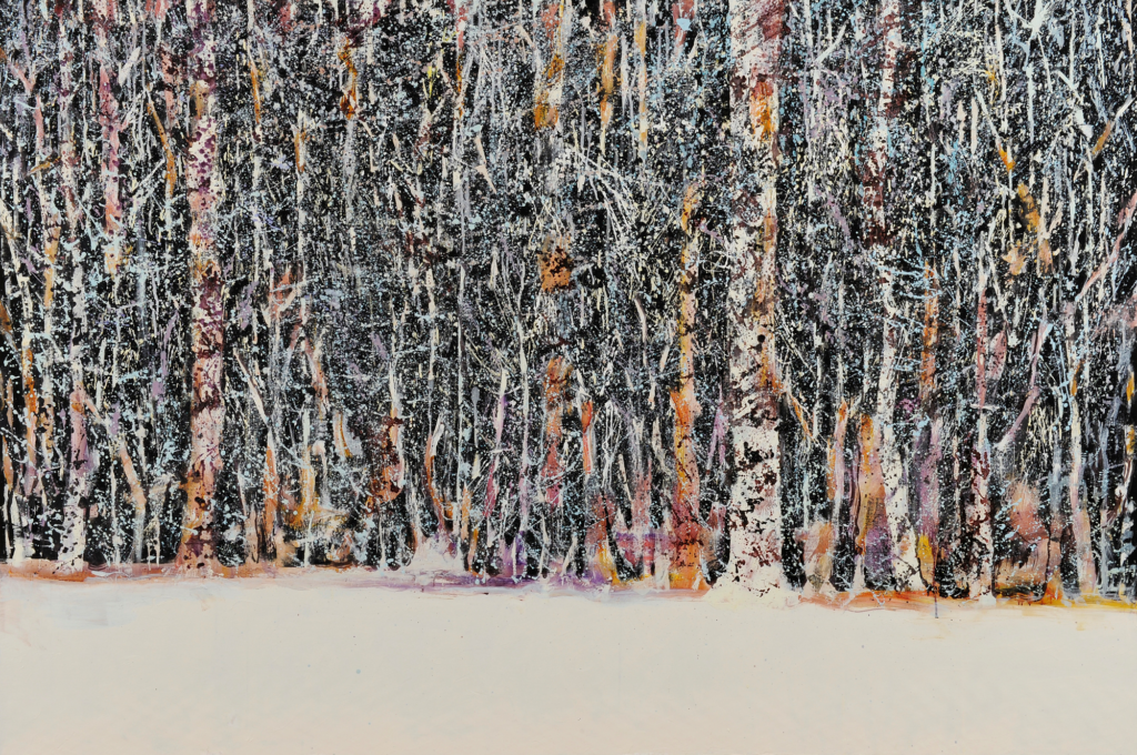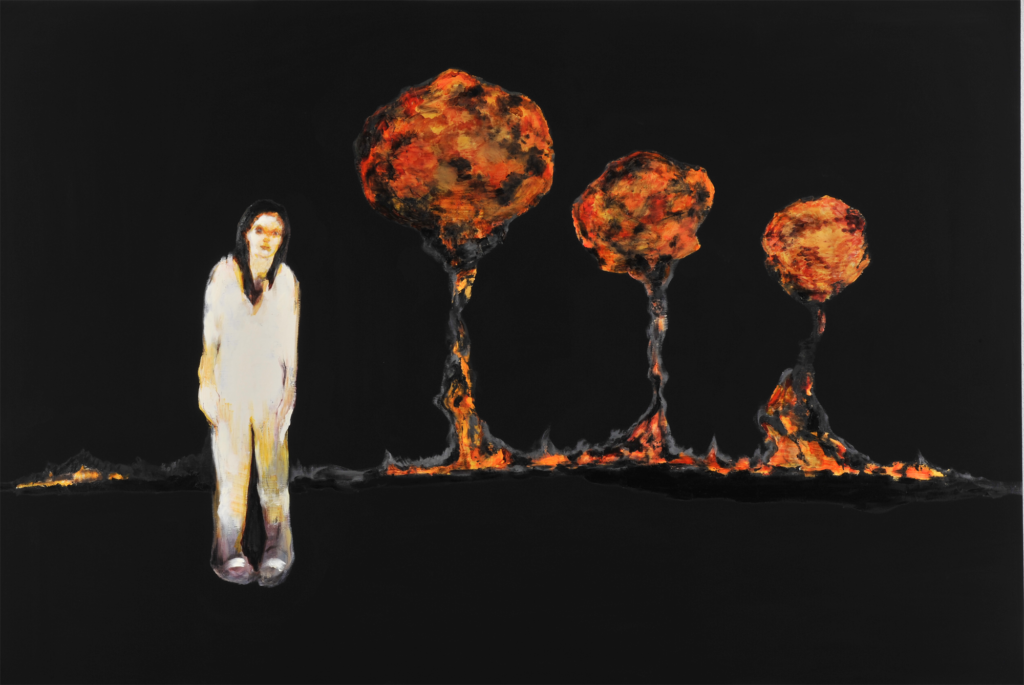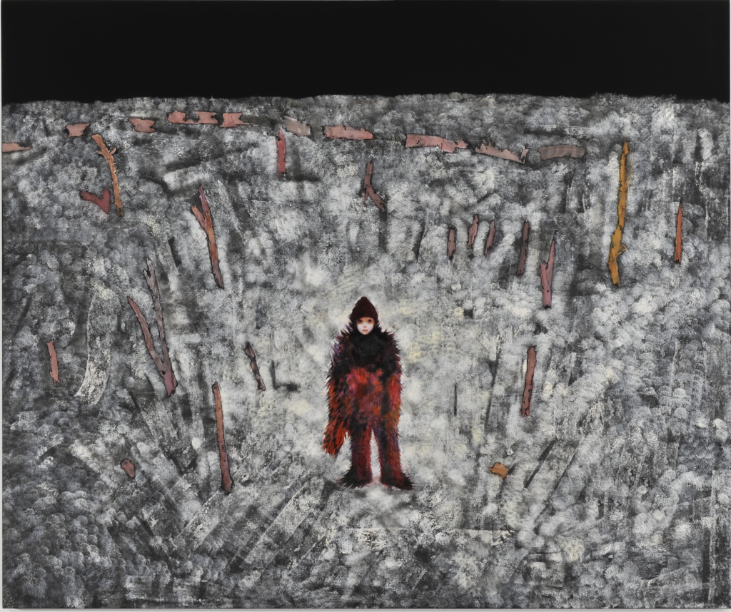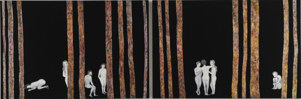 Wherever the viewer is in these paintings, they lose their way. Although the forest occasionally gives some indications as to the environment, it is above all the place that strips the viewer of their bearings. It’s a disturbing element that describes wandering and loss, that of life, including death. ‘Since childhood, I’ve been thinking about the date of my death, and I often think about how much time I have left to live. Maybe it’s because I nearly died when I was born that I’m aware of the danger of death.’ This death is anticipated, underlying, prevailing, omnipresent, and black.