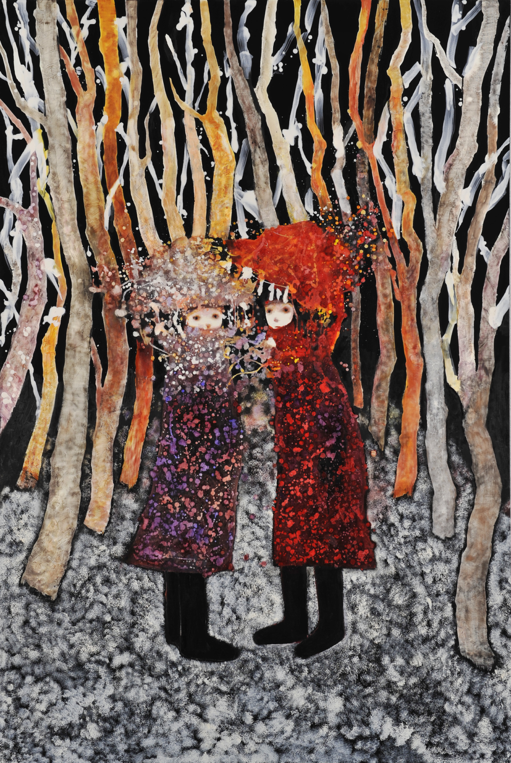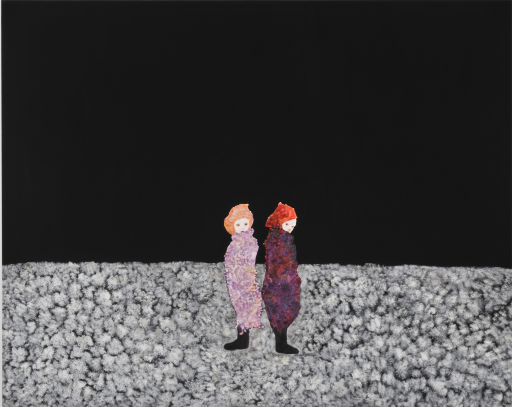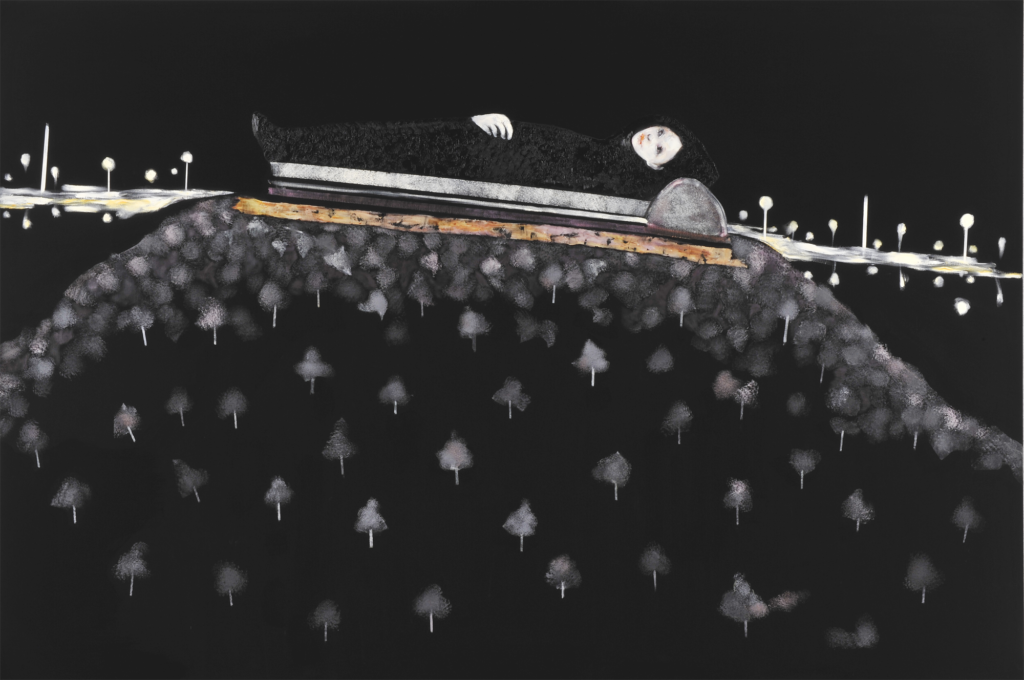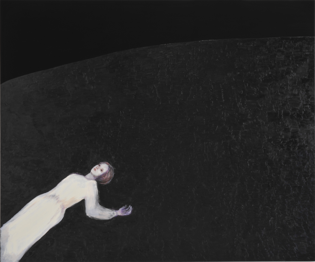 ‘By getting rid of the background, the viewers can focus on the person in the centre of the image.’ These heroines, though figurative, thus find themselves plunged into an abstract world tinged with mystery. Black becomes a character in itself, and participates in the narrative. ‘I think that using the colour black is a form of freedom, because it could transform into anything.’ These are waking dreams, but which remain very much nocturnal. ‘Many of my pieces depict the night. The darkness of the night is also the darkness that makes people feel uncomfortable.’