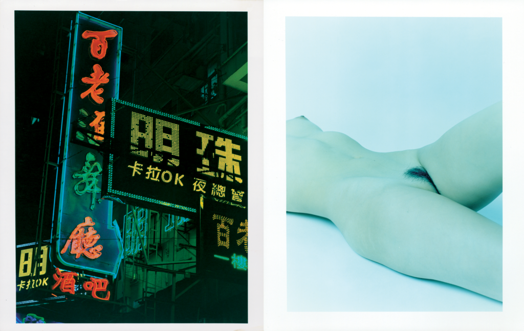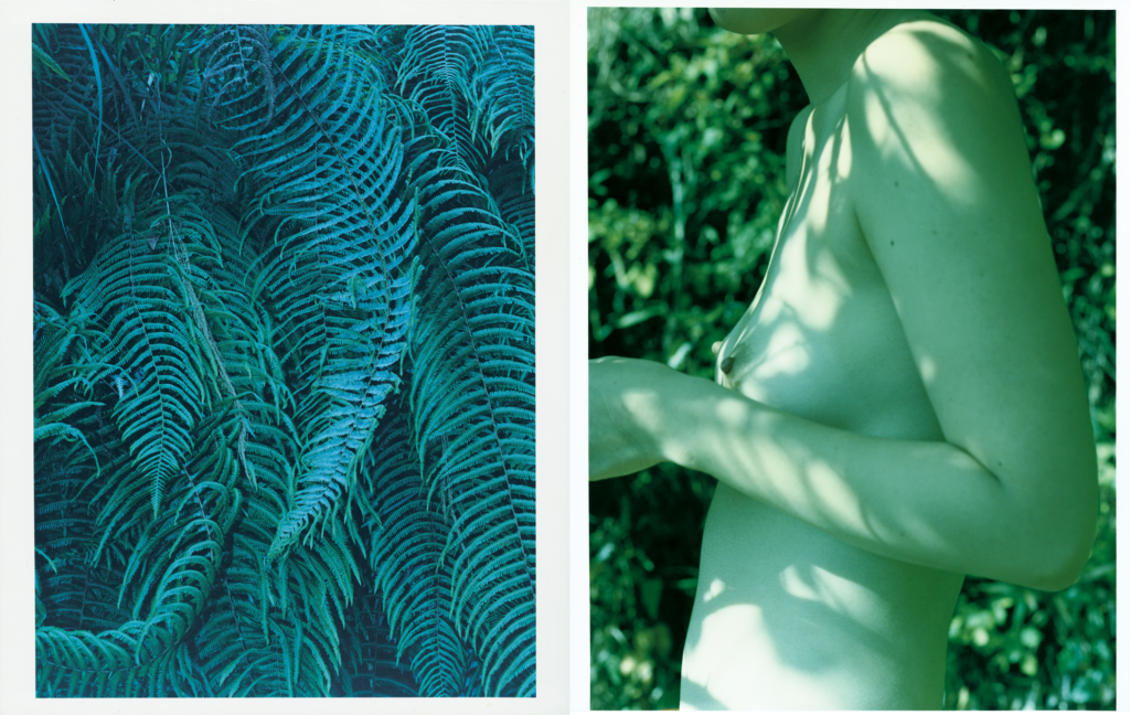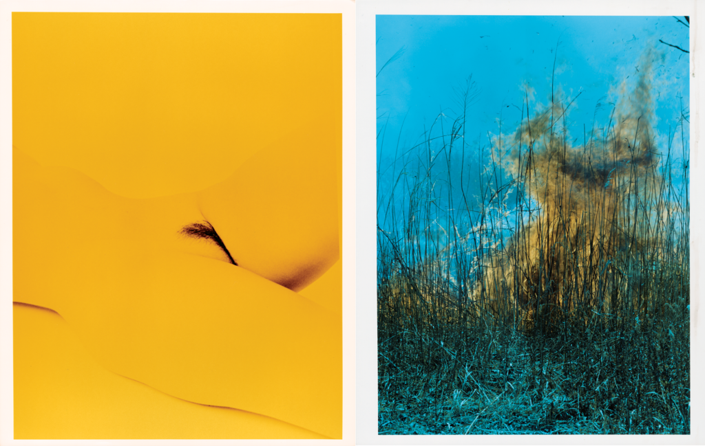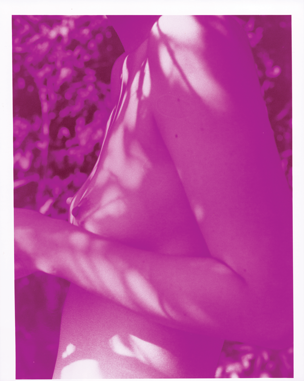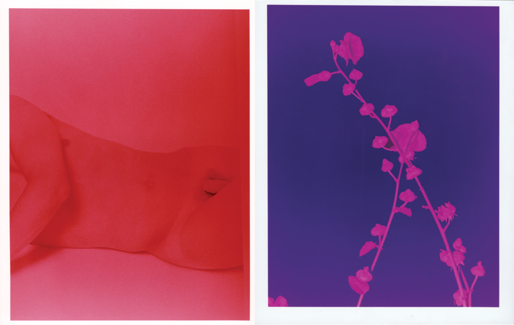 Rose, jaune, vert. Les couleurs nous font tinter la cornée, une explosion visuelle qui devient sonore par le rythme chromatique qui est donné. La dynamique s’accentue par la répétition. Une même photo peut changer de carnation, proposer un sens antagoniste ou complémentaire et composer toute une partition par l’enchaînement ou les associations qui sont faites. Les corps sont dénudés, les sexes apparents. On jouit d’une liberté joyeuse. Ni voyeuriste, ni ostentatoire, ni vulgaire, l’humain est exposé dans une forme d’innocence, calme et délectable. Les sujets participent à l’engouement, et au-delà des nuances bariolées, néons et boules à facettes nous invitent à la fête. Des fragments de corps et d’objets captés avec la même ardeur que le sont les minéraux et les plantes. Fonctionnant sous forme de métaphores, ces parallèles font des éléments un tout homogène.