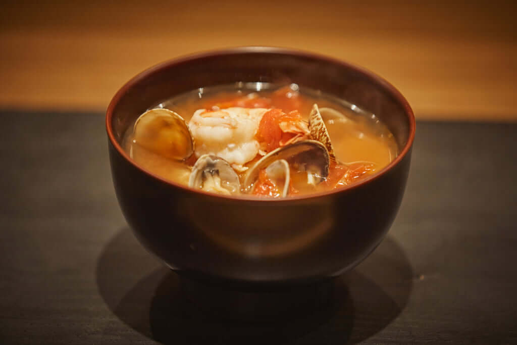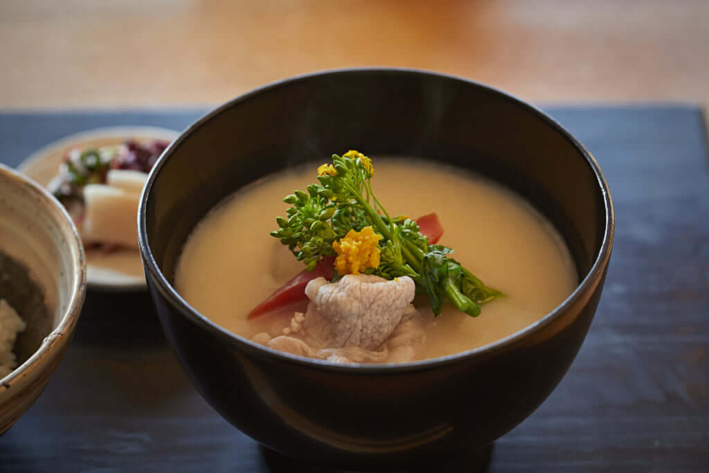 Ici, le service commence par une partie de kumiage yuba, de la peau de soja sur chou râpé surmonté d’une pointe de wasabi. Arrivent ensuite les soupes (viande, poisson ou légumes) et un petit bol de riz cultivé dans la préfecture de Shiga, servis dans un plat en céramique conçu à la main par des artisans de la région de Nara. « Notre inspiration de petit-déjeuner copieux vient des plats faits-maison par notre mère », peut-on lire sur le site du restaurant.